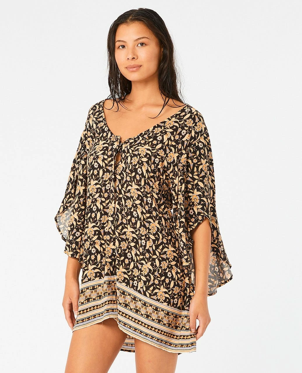 The Dreamer Kimono is a great and versatile women’s style that can be dressed up or thrown over swim after a day at the beach. Made with sustainability in mind from EcoVero fabric with solution dyed yarn, it’s a button through design with front tie, and the collection’s intricate all-over yardage print.